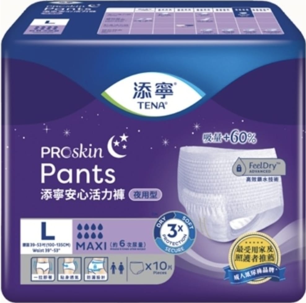 適合夜間使用,內褲型設計,穿脫方便;貼身剪裁,合身舒適;配合高分子吸收體,將尿液快速導流,防止滲漏,並能消除尿味;吸尿量達2500ml,比日用型紙尿褲吸量高60%,整晚加倍防漏